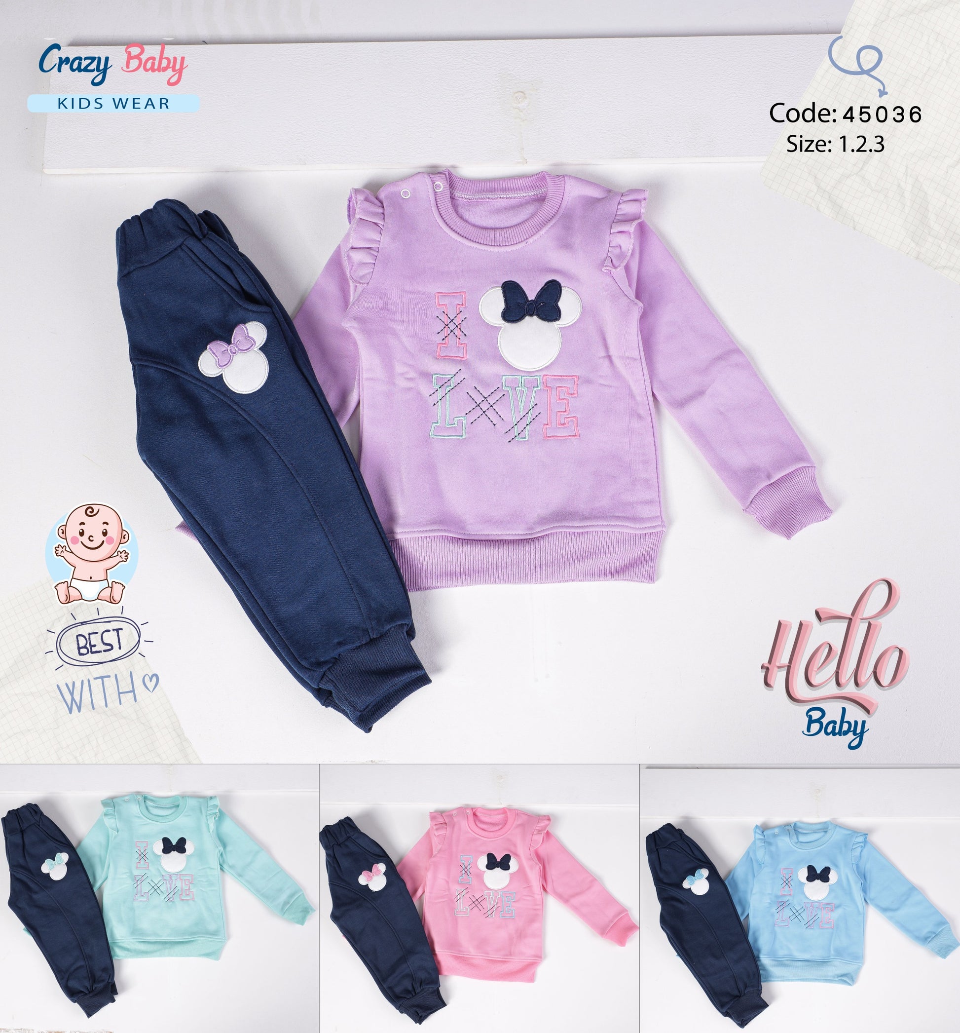 طقم شتوي بناتي مكوّن من سويت شيرت + بنطلون، مصمم من خامة ميلتون قطنية ناعمة ومعالجة خصيصًا لبشرة الأطفال الحساسة.